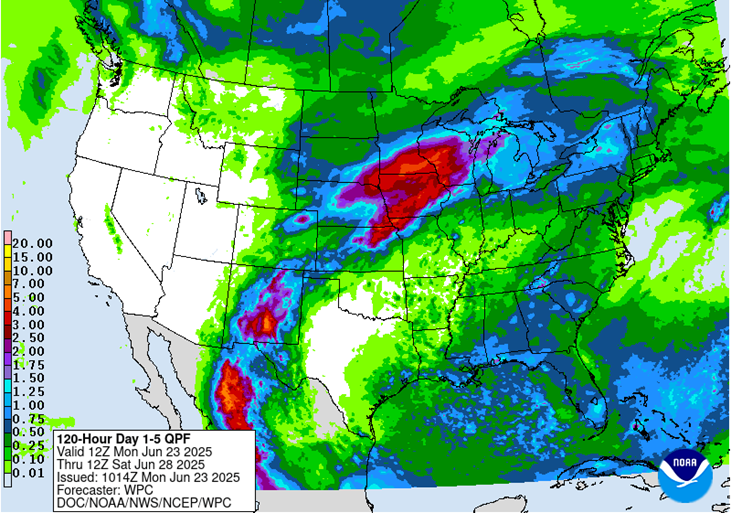 The Days 1-5 Precipitation Forecast is produced by the National Weather Service’s Weather Prediction Center for June 23-28, 2025.