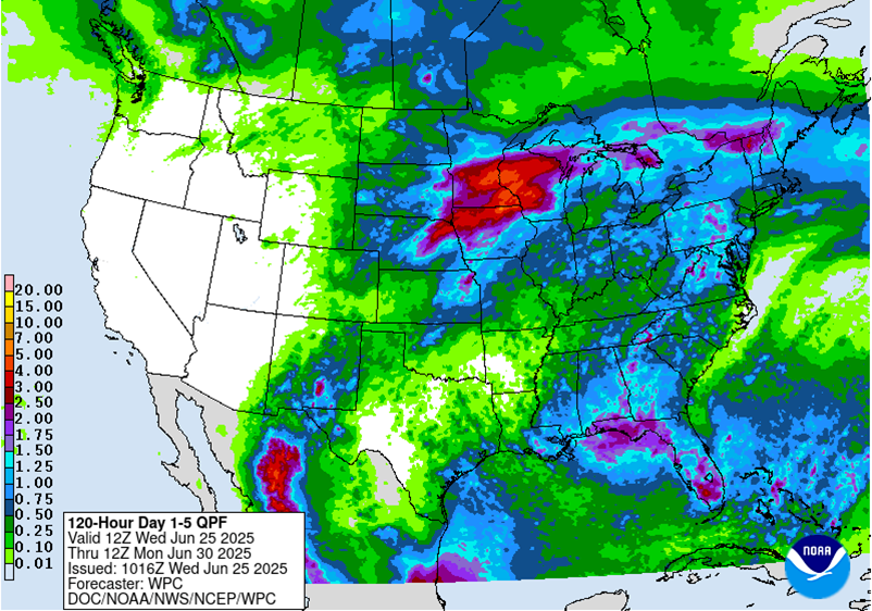 The Days 1-5 Precipitation Forecast is produced by the National Weather Service’s Weather Prediction Center for June 25-30, 2025.