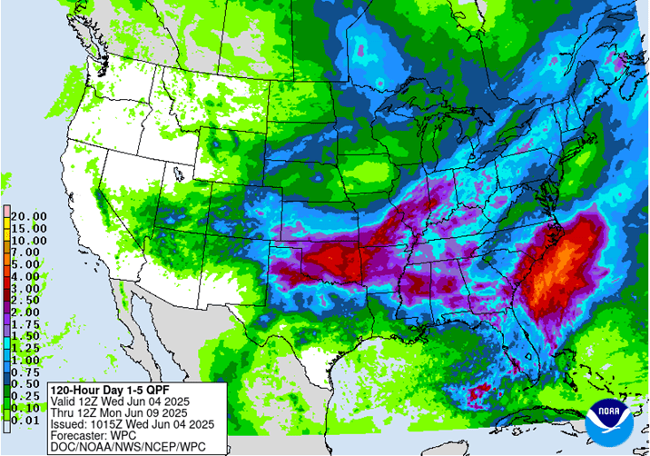 The Days 1-5 Precipitation Forecast is produced by the National Weather Service’s Weather Prediction Center for June 4-9, 2025. See 2-Day Rainfall Accumulation (inches) measured by Oklahoma Mesonet.