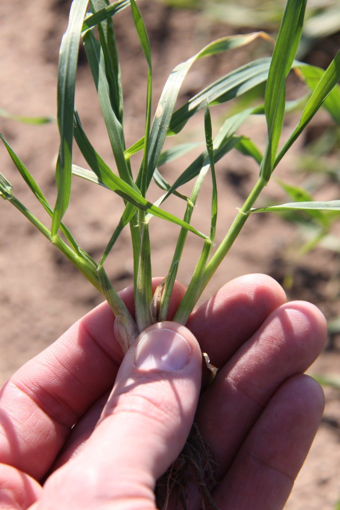 Well-tillered wheat at McLoud Published November 21, 2012 at 1584 × 2376 in How dry is it? Wheat at McLoud, OK on 11/20/2012 with three large tillers and three additional tillers initiated. This wheat is on its way to top yield potential.