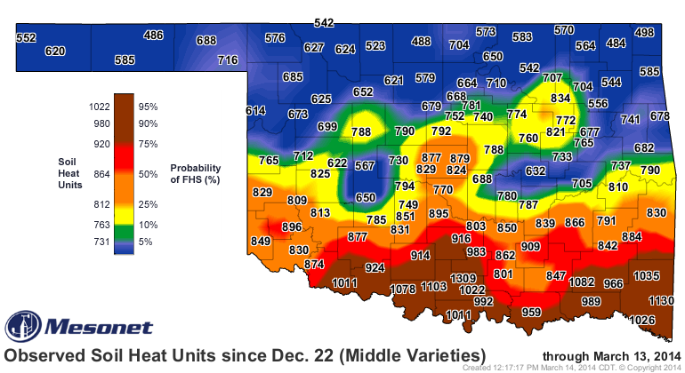 WB-Cedar and Sy Llano reached first hollow stem this week, and there are several additional early-maturing varieties that are near first hollow stem. The results from a March 13 sampling of plots are posted below, and we will post results from another sample early next week. I have also posted the map from the Oklahoma Mesonet’s First Hollow Stem Advisor for medium maturity varieties. As indicated in the map, most wheat south of I-40 is likely at or past first hollow stem.