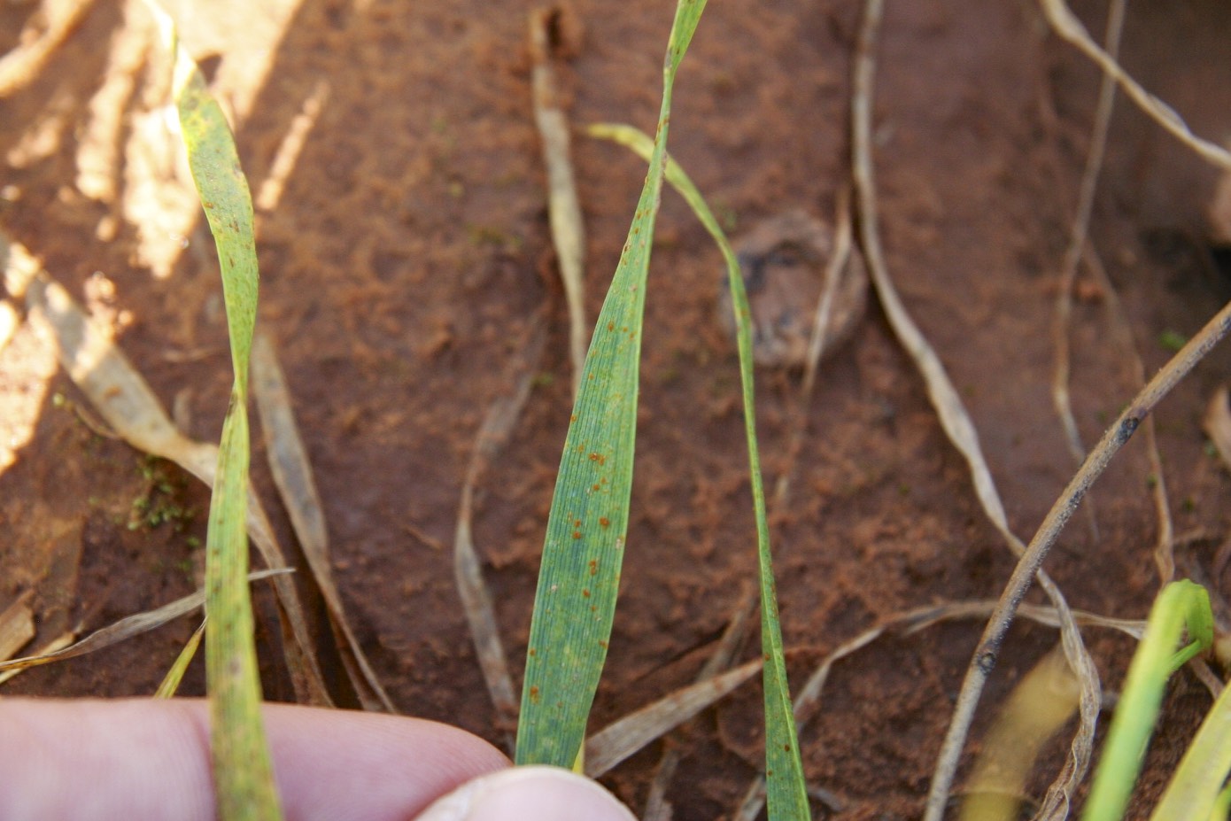 When leaf rust occurs in the fall in Oklahoma, the question arises regarding the value of spraying to control that rust. Fall-infected leaf rust plants typically have yellowed lower/older leaves with rust pustules, but the youngest 2 or 3 leaves are green and healthy. As temperature drops through November and December, the older rust-infected leaves die and new infections are greatly slowed and inhibited. Grazing also helps to remove these leaves and increase air circulation and drying that are conditions less favorable to spread of the disease. Given these considerations, spraying to control leaf rust in the fall is of limited value. The primary concern with fall infections of leaf rust is that with a mild winter and sufficient moisture, the rust will survive through the winter and inoculum will be present in fields to start the disease early in the spring. Hence, monitoring of these fields through the winter and early next spring is recommended to determine if a split application of a fungicide is merited to control the rust (and also possibly tan spot, septoria, and/or powdery mildew) in the early spring.