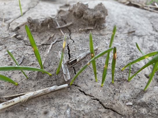 Many postemergence herbicides labelled for use in wheat recommend the crop be at 2 or 3 leaves. Be sure to check these requirements to ensure crop safety.