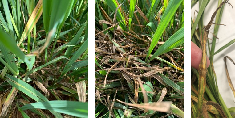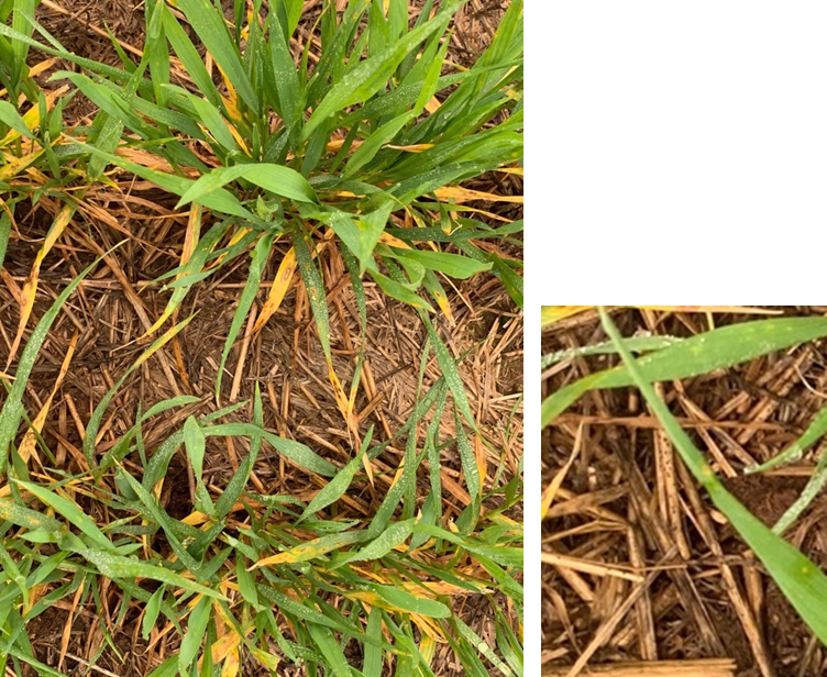 First, yellowing and leaf death is the result of natural senescence of the older leaves that then are colonized by saprophytic fungi that lead to a mottling appearance in the leaves. That is what I believe happened in the sample represented by photos in Figure 1 (photos from Brooke King). Notice the leaves in the white boxes in the photo on the left. These leaves have dead tissue that appears quite “old” and has been colonized by saprophytic fungi that add to the mottled appearance of the leaves as can be seen more clearly in the center photo. A few of these leaves you can see in Figure 1 also have a general yellowing that indicates the leaf is dying and will be colonized by saprophytic organisms including fungi that live only on the dead tissue and do not cause leaf spotting diseases. I have not been able to isolate pathogenic fungi from leaf samples such as this, and therefore surmise that abiotic factors such as temperature and soil wetness contributed to the leaf yellowing that then led to colonization by saprophytic fungi and other organisms. Another factor often present in such cases is that there is no or only minimal wheat residue in these fields. Lack of wheat residue indicates there should be no or very little inoculum of the fungi that cause the leaf spotting diseases mentioned earlier, which indicates that leaf spot diseases are not involved.