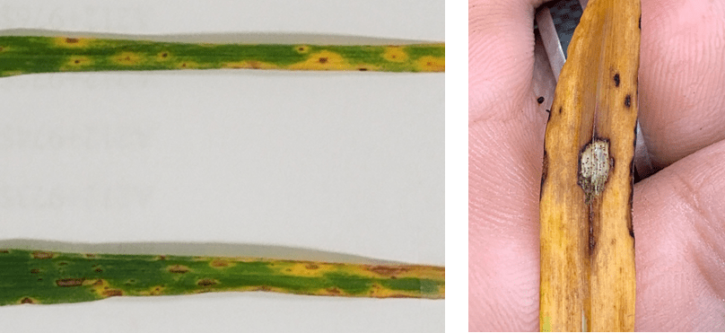 Other photos of leaves showing primarily tan spot have been sent in by Gary Strickland (County Educator; Jackson County) in southwestern OK (Figure 3 – photo on the left). It is likely that Septoria leaf blotch also is present in these samples represented in Figures 2 and 3, and in fact in the photos submitted by Zack Meyer, Septoria is present on one of the leaves as shown in the photo on the right in Figure 3. Note that leaf spots such as this are not visible in the photos in Figure 1. That’s not to say there are absolutely no leaf spots present in sample 1, just not at anywhere near the frequency as in photos in Figures 2 and 3.