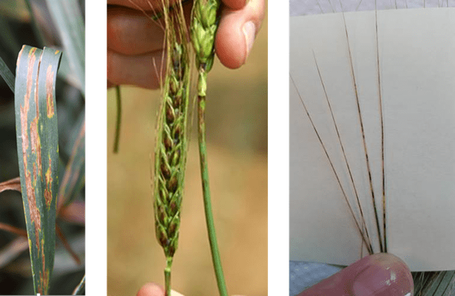 Stripe rust has fairly well shut down across the state as indicated by turning to the telial spore stage (see 27-April update at http://entoplp.okstate.edu/pddl/2020/PA%2019-15.pdf), and although this cool weather with rainfall and dew in central OK will favor stripe rust, I doubt if we will stay sufficiently cool and wet for stripe rust to pick up again across Oklahoma (plus, northwestern OK and the panhandle remain dry). However, leaf rust has started to become more prevalent over this past week and likely will continue to increase in areas where there is rainfall or dew formation. This past week around Stillwater, both Dr. Brett Carver and I were able to rate plots and trials around Stillwater for leaf rust incidence and severity. Additionally this past week here at Stillwater for the first time in about a decade, I found wheat stem rust. Recall there are three wheat rusts including stripe rust, leaf rust, and stem rust. Stem rust is rare in Oklahoma and is only observed in years when we have an extended cool spring (much like this one). Figure 1 shows photos comparing these three rusts on wheat leaves. In contrast to the implication of its name, stem rust can occur on leaves as well as on stems, whereas pustules of stripe rust and leaf rust are more typically found on leaves.