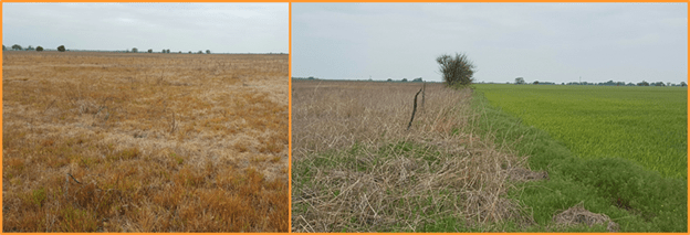 Given this disease cycle, it is easy to see several factors that determine the incidence and severity of these diseases. First, controlling volunteer wheat and other grassy weeds that serve as alternative hosts for the mite and the viruses is imperative to help limit these diseases. Often an infected field of commercial wheat is growing immediately adjacent to a field left fallow during the fall and winter (Figure 2). The fallow field contained abundant volunteer wheat and grassy weeds from which WCMs carrying Wheat streak mosaic virus (WSMV) spread into the commercial field. Wheat infected in the fall will be severely damaged the next spring. Wheat infected in the spring also is damaged, but not as severely as wheat infected in the fall. Hence, it is imperative to do yourself and your neighbors a favor by controlling volunteer wheat and grassy weeds in fields left fallow – especially, if they are adjacent to commercial wheat fields.