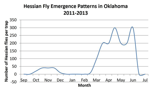 Hessian fly: Hessian fly (Figure 4.) infestations can occur in the fall and spring. Fall infestations arise from over-summering pupae that emerge when climate conditions become favorable. In states north of Oklahoma, a “Hessian fly free” planting date often is used to help limit fall infestations by Hessian fly. However, such a planting date does not apply in Oklahoma because Hessian fly can emerge in Oklahoma as late as December (Figure 5.).