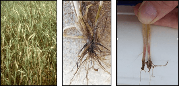 Root and foot rots: These are caused by fungi and include several diseases such as dryland (Fusarium) root rot, Rhizoctonia root rot (sharp eyespot), common root rot, take-all, and eyespot (strawbreaker). Every year samples are received in the lab that are diagnosed with root rot. Typically wheat affected by seedling/root rots are either submitted in the fall when wheat is in the seedling stage or in later May and early June as plants are maturing. Germinating seeds and seedlings have small root systems that if infected impacts seed germination and seedling emergence (Figure 6). Later in the season (late May/early June), root rots again become apparent as maturing plants are unable to obtain sufficient moisture to finish grain development especially if drought conditions are present. In mature plants, white heads often indicates the presence of root rot (Figure 7).