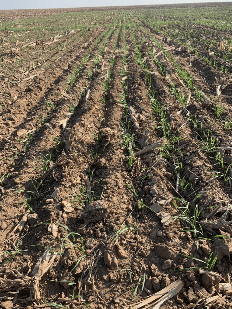 Wheat stand at Keyes, OK on October 7, 2020. Planted on September 22, 2020. Photo: Robert Calhoun, the Senior Agriculturalist of OSU Small Grains Program.