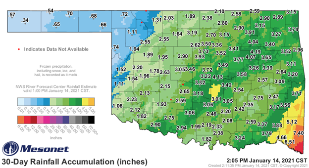 Usually, the alarm for beginning wheat nitrogen (N) topdressing gets sounded right away in early January. A significant portion of the Oklahoma wheat belt has received a good amount of moisture in the past weeks, which was great to save the crop from the severe drought in the fall. However, some parts of the state would still benefit from additional moisture (Fig. 1).