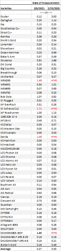 Table 2. First hollow stem (FHS) results for each variety collected at Stillwater. Plots were planted on 09/21/2020. The threshold target for FHS is 1.5 cm (5/8″ or the diameter of a dime). The value of hollow stem for each variety represents the average of ten measurements from non-grazed plots. Varieties that have reached FHS are highlighted in red.