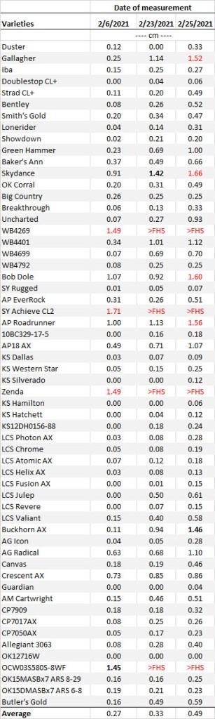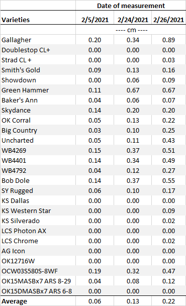 Table 1. First hollow stem (FHS) results for each variety collected at Chickasha. Plots were planted on 09/29/2020. The threshold target for FHS is 1.5 cm (5/8″ or the diameter of a dime). The value of hollow stem for each variety represents the average of ten measurements from non-grazed plots. Varieties that have reached FHS are highlighted in red.