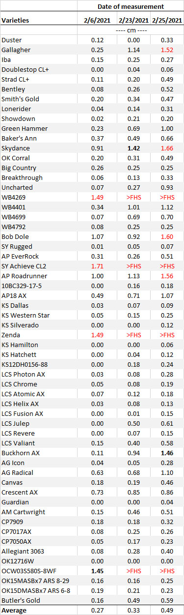 Table 1. First hollow stem (FHS) results for each variety collected at Chickasha. Plots were planted on 09/29/2020. The threshold target for FHS is 1.5 cm (5/8″ or the diameter of a dime). The value of hollow stem for each variety represents the average of ten measurements from non-grazed plots. Varieties that have reached FHS are highlighted in red.