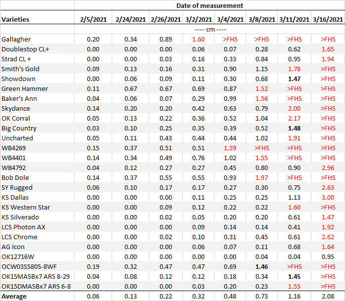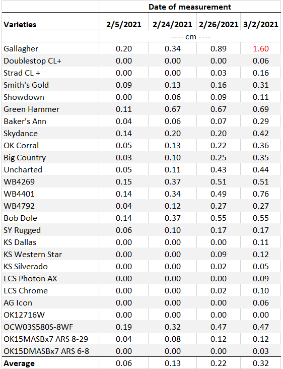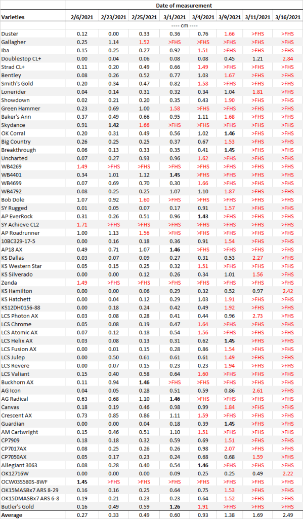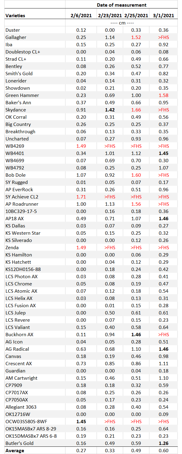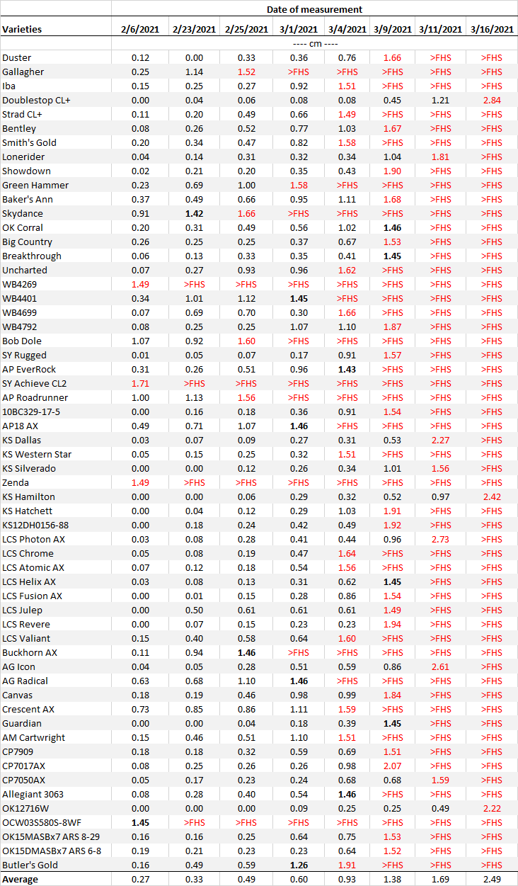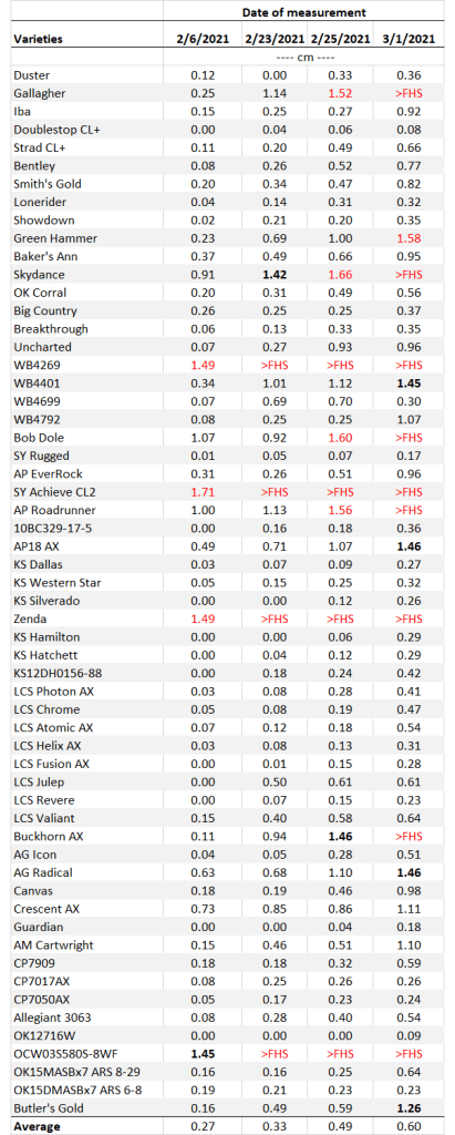 “We visited the naturally inoculated Rust Evaluation Nursery at Castroville, TX today. The nursery is about 196 miles from Texas A&M University’s main campus in College Station, where we are based. We also visited our trials at Uvalde, TX today. Stripe rust is not very active at both Castroville and Uvalde. Leaf rust is now picking up, especially at the Rust Evaluation Nursery at Castroville. Stripe rust is very actively spreading at the Agronomy Farm near our main campus in College Station as of our last visit on March 23, 2021. Stripe rust is also active in our trials in Greenville (50 miles northeast of Dallas). No reports yet of leaf or stripe rusts in the Texas High Plains. Leaf rust is also developing in our trials at Wharton (60 miles southwest of Houston).”