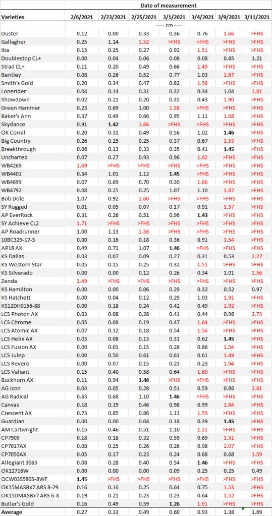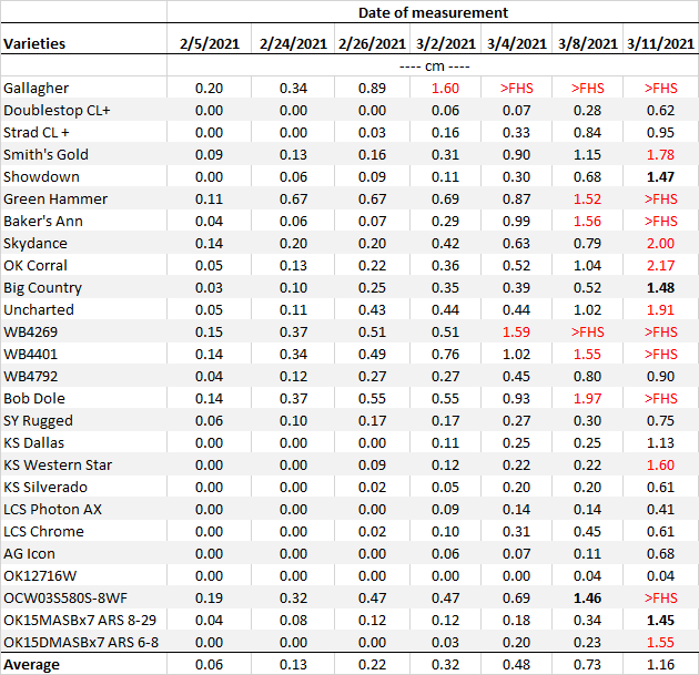 Table 2. First hollow stem (FHS) results for each variety collected at Stillwater. Plots were planted on 09/21/20 but not grazed or clipped. The threshold target for FHS is 1.5 cm (5/8″ or the diameter of a dime). The value of hollow stem for each variety represents the average of ten measurements. Varieties exceeding the threshold are highlighted in red.