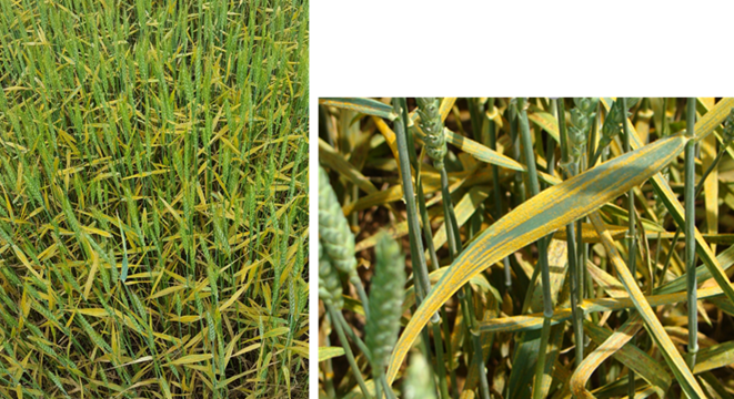 Other diseases observed included barley yellow dwarf, which was present at all locations but did not seem to occur over large areas. Another disease observed at a low incidence was loose smut (Figure 2; left photo; credit Mike Schulte). If you recall, last year there was a higher than typical occurrence of loose smut across Oklahoma and although present again this year, loose smut seems to be more sporadic and at a lower incidence compared to 2020. Another disease that we did not see at these southern OK field days was wheat streak mosaic virus (Figure 2; right photo). However, we continue to receive a steady number of samples that are testing positive for Wheat streak mosaic virus, High plains virus, or both. These samples are coming from northern to northwestern OK and the panhandle, and it appears that mite transmitted virus diseases such as wheat streak mosaic and high plains virus will be a significant factor in certain fields in 2021.