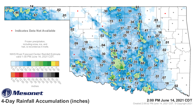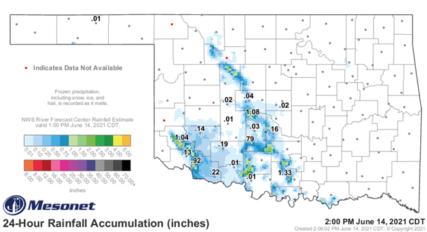 Altus- Harvest was successful in this region prior to heavy rains received over the weekend. This region received 1.4 to 1.9 inches of moisture over the weekend and harvest will be at a standstill most likely the next couple days. Test weights to this point ranging from 61 lbs./bu. to 63 lbs./bu. with yields being reported in the mid 30’s to mid 40’s for the most part. Harvest 50% to 60% complete.