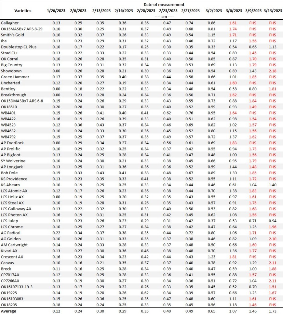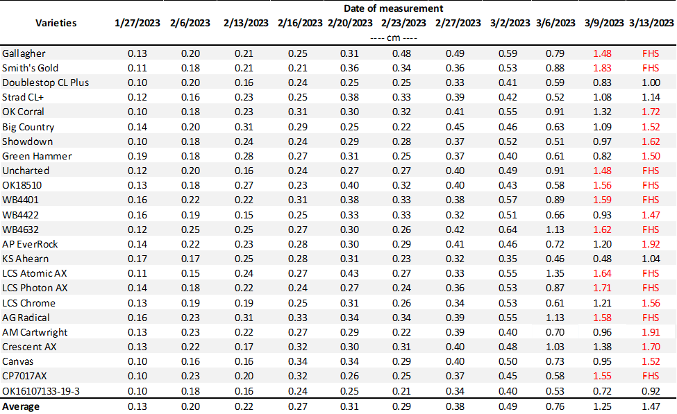 Table 2. First hollow stem (FHS) results for each variety collected at Chickasha. Plots were planted on 10/07/22 but not grazed or clipped. The threshold target for FHS is 1.5 cm (5/8″ or the diameter of a dime). The value of hollow stem for each variety represents the average of ten measurements. Varieties exceeding the threshold are highlighted in red.
