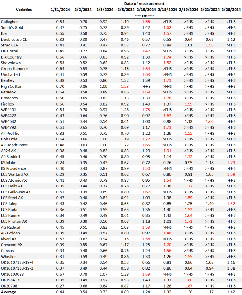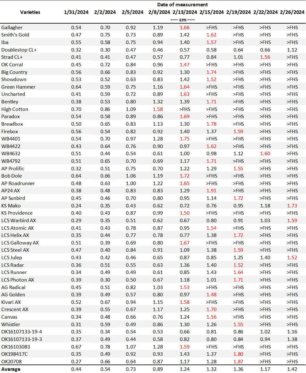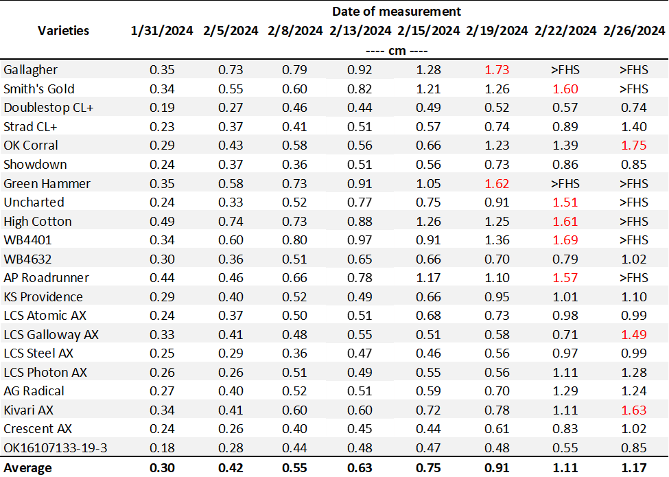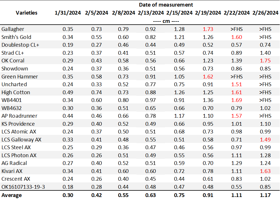 Table 2. First hollow stem (FHS) results for each variety collected at Chickasha. Plots were planted on 09/21/23 but not grazed or clipped. The threshold target for FHS is 1.5 cm (5/8″ or the diameter of a dime). The value of hollow stem for each variety represents the average of ten measurements. Varieties exceeding the threshold are highlighted in red.