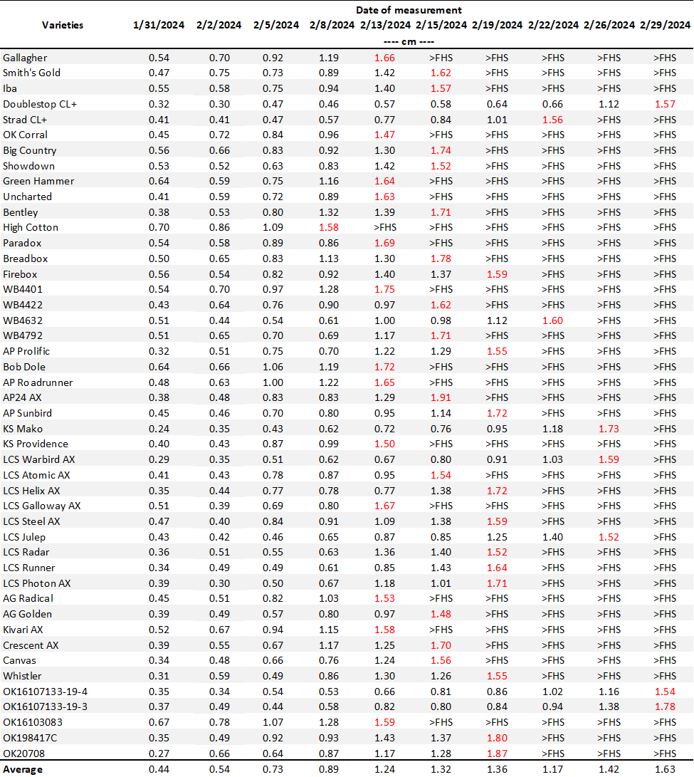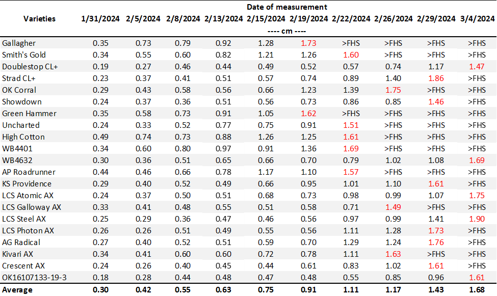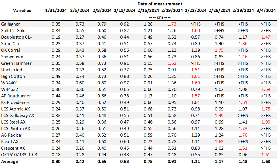 Table 2. First hollow stem (FHS) results for each variety collected at Chickasha. Plots were planted on 09/21/23 but not grazed or clipped. The threshold target for FHS is 1.5 cm (5/8″ or the diameter of a dime). The value of hollow stem for each variety represents the average of ten measurements. Varieties exceeding the threshold are highlighted in red.