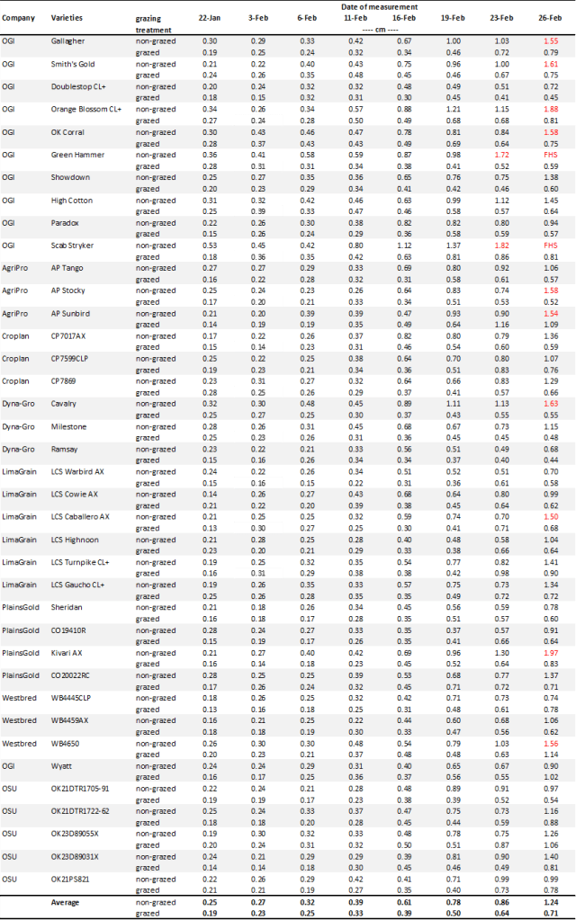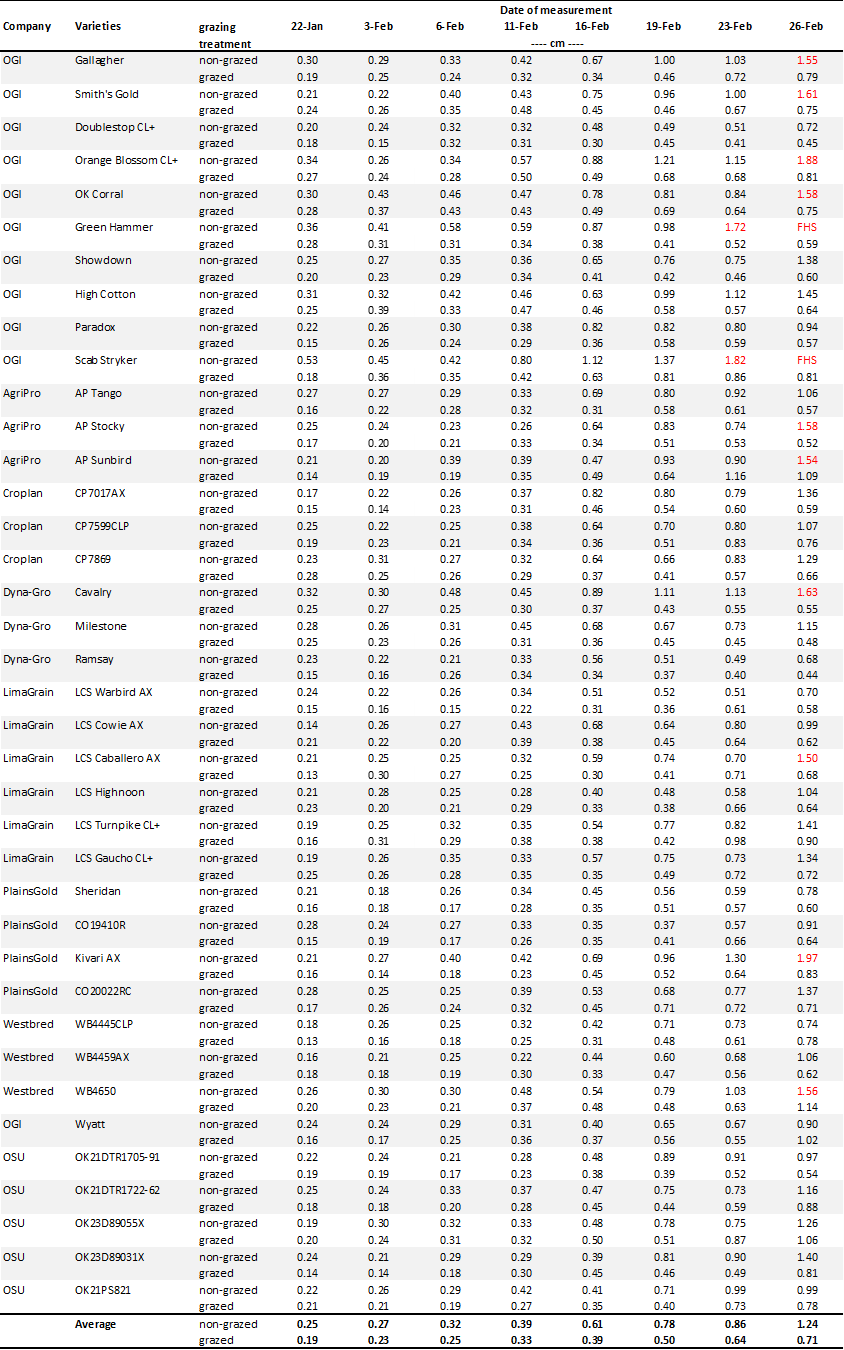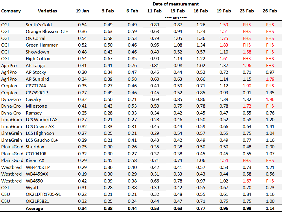 The latest FHS results for each variety planted in our forage trials at Stillwater and Chickasha are summarized below (Tables 1 and 2). Some varieties have reached the 1.5 cm FHS threshold.
