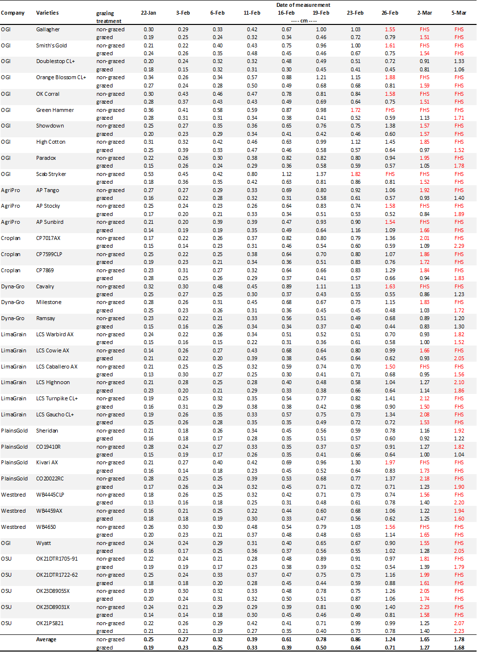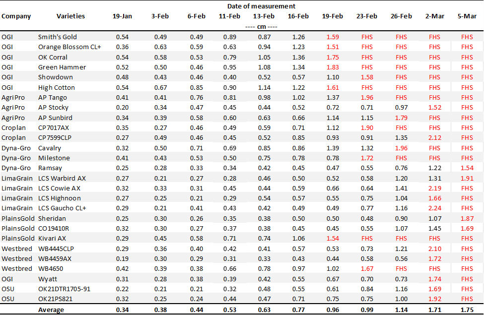 The latest FHS results for each variety planted in our forage trials at Stillwater and Chickasha are summarized below (Tables 1 and 2). Most varieties have reached the 1.5 cm FHS threshold.