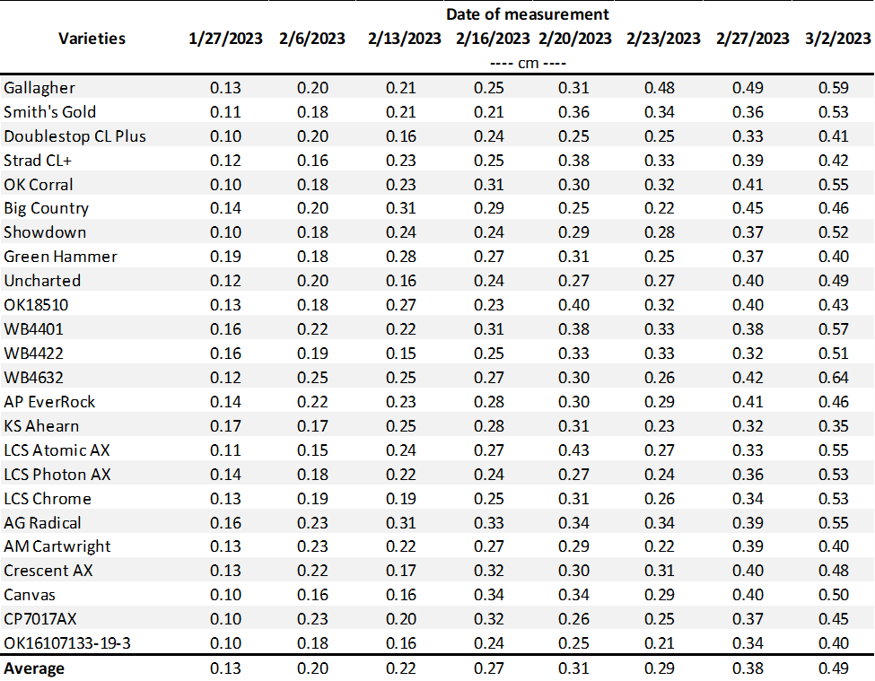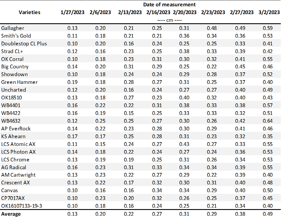 Table 2. First hollow stem (FHS) results for each variety collected at Chickasha. Plots were planted on 10/07/22 but not grazed or clipped. The threshold target for FHS is 1.5 cm (5/8″ or the diameter of a dime). The value of hollow stem for each variety represents the average of ten measurements. Varieties exceeding the threshold are highlighted in red.