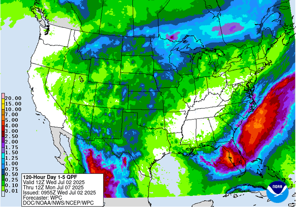 The Days 1-5 Precipitation Forecast is produced by the National Weather Service’s Weather Prediction Center for July 7-12, 2025.