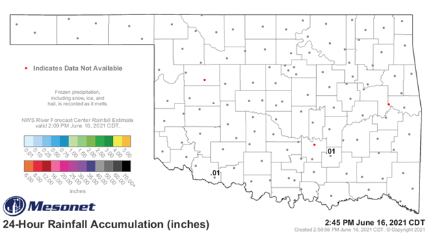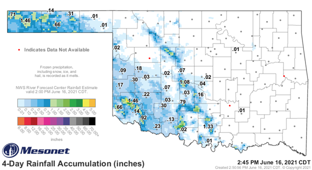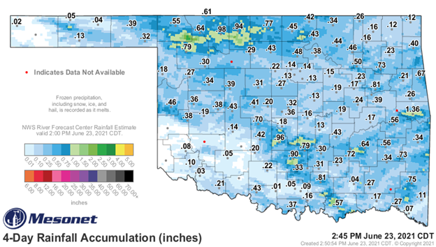 Perry/Tonkawa/Ponca City/Blackwell– Harvest reported at 50% complete. Test weights ranging from 58 to 61 pounds per bushel. Protein averages around 12 to 13%. Yields making in the mid 20’s to mid-40’s with some areas reporting higher yields on management intensive wheat.
