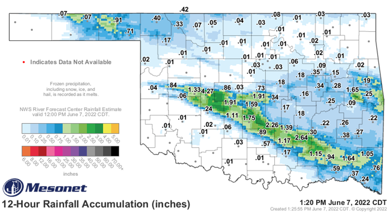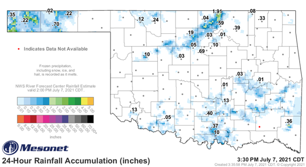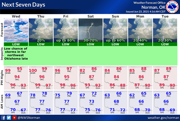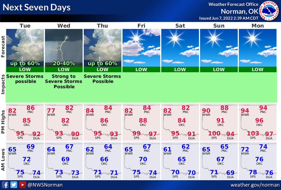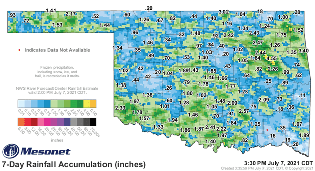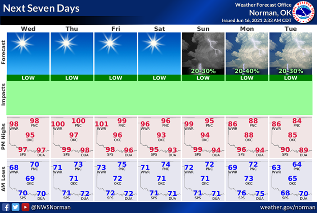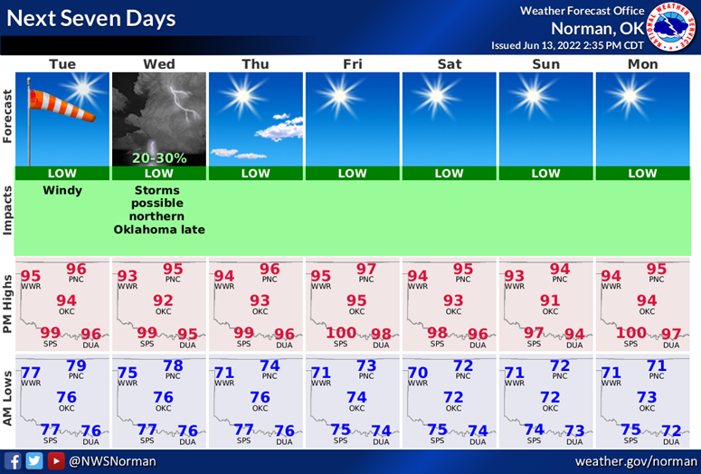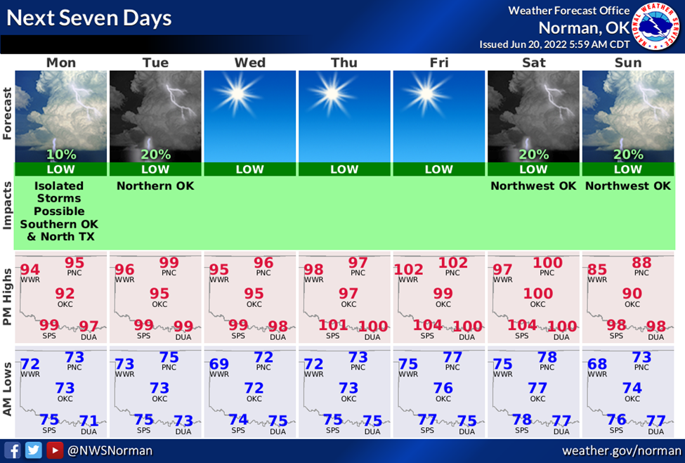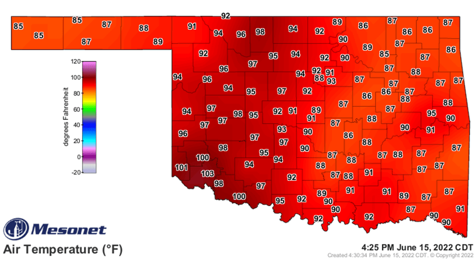 Below see the Heat Maximum and Air Temperatures at 11:35 a.m. on Monday June 20th along with the maximum air temperature above 100 since January 1, 2022. Also please see the 7-day forecast provided by the Oklahoma Mesonet. The next harvest report will be scheduled for Wednesday, June 22, 2022.