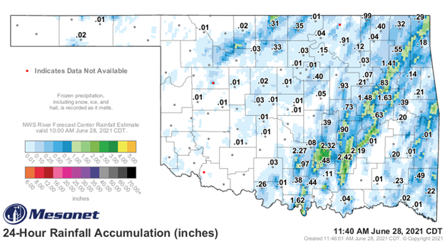 El Reno- They are reporting 88% harvested in this region. Yields are being reported from the low 20’s to the low 40’s depending on variety and management. Test weights ranging from 57 to 59.5 pounds per bushel. Protein ranging from 11% to 14.5%