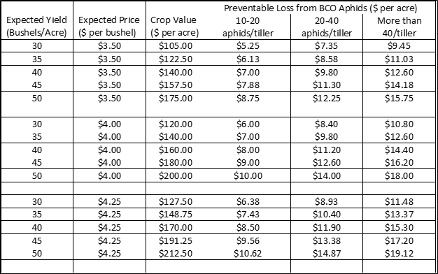 Unpublished research provided by Dr. Kris Giles (OSU) and Dr. Norm Elliott (USDA-ARS) combined with studies on spring wheat from the Dakotas and Minnesota indicate that 20-40 BCOA per tiller causes 5-9% yield loss before wheat reaches the boot stage. My suggestions: if BCOA numbers average 10-20 per tiller, figure on a 5% loss, if 20-40 per tiller, figure a 7% loss, and if BCOA aphids are more than 40 per tiller, figure a 9% loss.