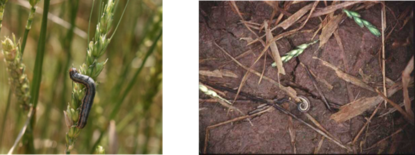 This cool, rainy spring weather, while providing excellent growing conditions for wheat, is also foodstuff for “producing” armyworms. Armyworm infestations typically occur in late April through the first two weeks of May. They feed on leaves and awns, (below left) and occasionally clip the head from developing plants. The head clipping (below right) I have noticed over the years is mostly restricted to secondary tillers with very small, green heads that contribute very little to yield.
