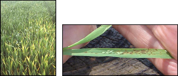 Figure 3. Spot in field (left) of barley yellow dwarf (BYD) as would be seen in March or April. Many types of aphids (for example, greenbug; right) transmit the viruses that cause BYD.