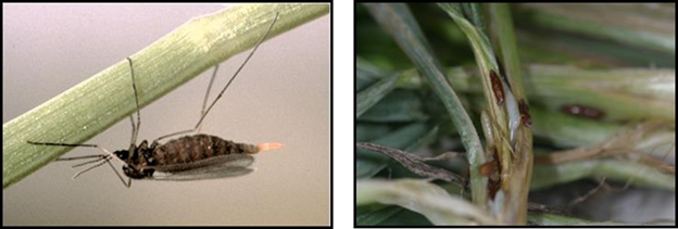 Figure 4. Adult Hessian fly (left) and larvae and pupae of the Hessian fly (right).
