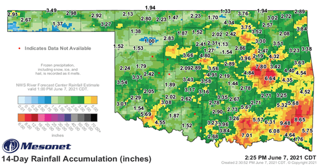 The 2021 wheat harvest has begun with several locations in Southwest, Oklahoma, reporting a successful weekend for grain being received. The following counties that received grain in elevator locations were Harmon, Jackson, Tillman, Cotton, Comanche, Kiowa and Greer. A few reports of sample loads being accepted in Frederick on Saturday, May 29th. Rain showers across Southwestern, Oklahoma, over the Memorial Day weekend hindered producers from making any progress over this past week until Saturday, June 5th. During this period, cooler temperatures, cloud cover and high moisture levels on the grain have slowed progress on harvesting the crop. Traditionally combines are rolling in Southwest, Oklahoma Memorial Day weekend or before, but unseasonable cool temperatures and rain has delayed the crop maturing. High quality and favorable test weights have been noted so far. Rains across Southwest, Oklahoma, late last night and early this morning have put harvest on standstill again in several regions, while in other areas producers hope to get rolling again later this afternoon, west of Tillman and Kiowa counties. In a large area of Tillman county, producers are reporting 3 to 5 inch rains last night, which will delay harvest another 4 to 5 days. Regions of Cotton and Comanche county locations received 1/10th to 2.5 inches of moisture depending on location.