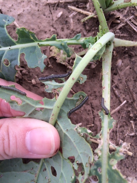 Look for window pane damage in young canola plants. Treatment threshold is one or more worms per foot of row.