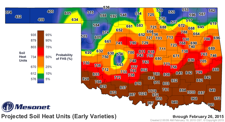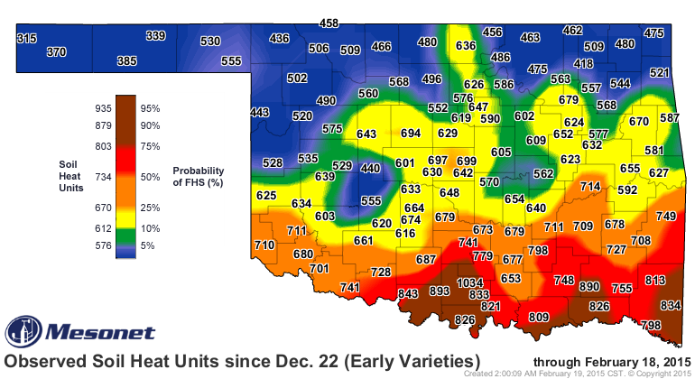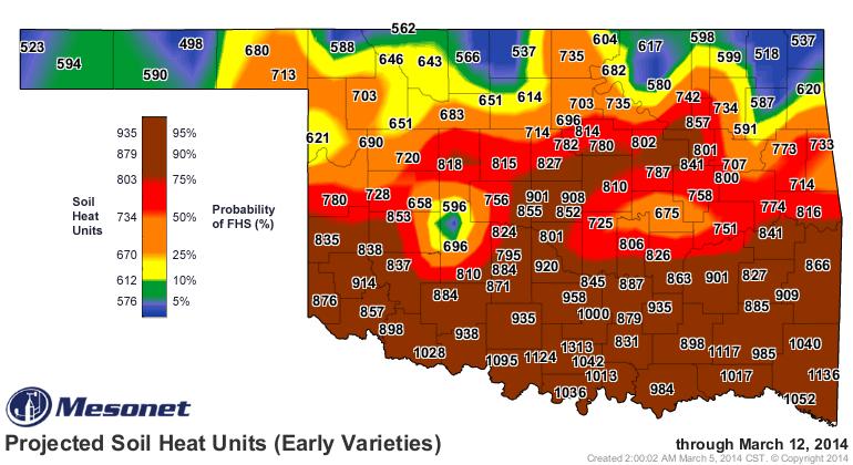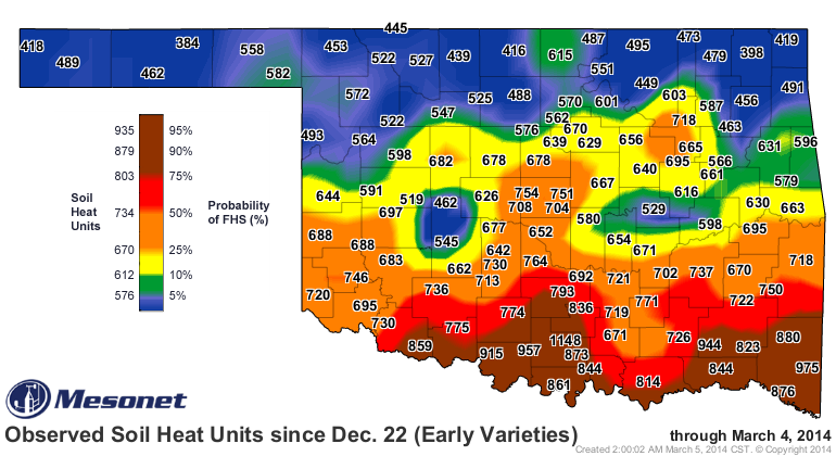 First hollow stem data are reported in ‘day of year’ (day) format (table below). To provide reference, keep in mind that March 1 is day 60. Average occurrence of first hollow stem at Stillwater in 2014 was day 77. This was approximately five days later than 2013 and 25 days later than in 2012 and was the result of much cooler than normal temperatures. Unlike previous years, there was only about ten days difference among varieties in occurrence of first hollow stem.