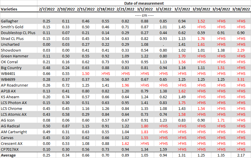 Table 2. First hollow stem (FHS) results for each variety collected at Chickasha. Plots were planted on 09/28/21 but not grazed or clipped. The threshold target for FHS is 1.5 cm (5/8″ or the diameter of a dime). The value of hollow stem for each variety represents the average of ten measurements. Varieties exceeding the threshold are highlighted in red.