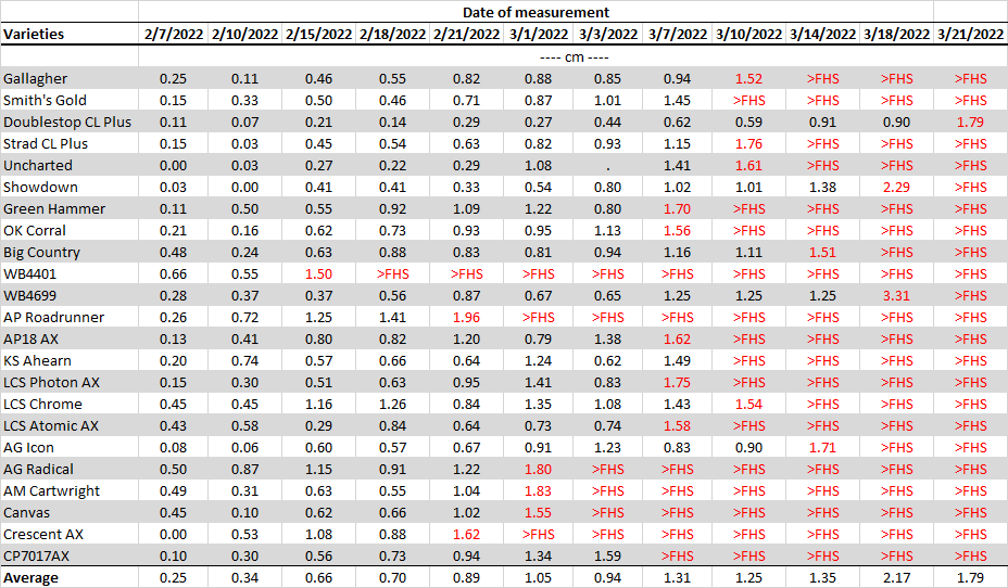 Table 2. First hollow stem (FHS) results for each variety collected at Chickasha. Plots were planted on 09/28/21 but not grazed or clipped. The threshold target for FHS is 1.5 cm (5/8″ or the diameter of a dime). The value of hollow stem for each variety represents the average of ten measurements. Varieties exceeding the threshold are highlighted in red. The overall average represents the mean FHS for the varieties measured within a date.