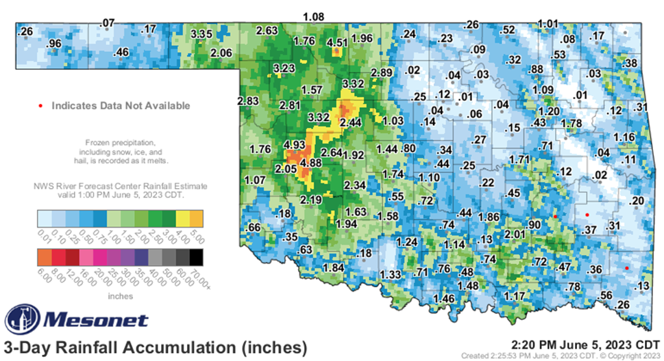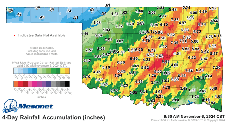 In early November, wheat-growing regions across Oklahoma received between 1 and nearly 8 inches of rain, while the Panhandle saw up to 20 inches of snow from November 5–9 (Figure 2). These events quickly shifted conditions from extreme drought to flooding. Although November temperatures were above average (~53°F), seeds remained in cool, wet soils for weeks, leading to slow or failed germination. Some areas experienced standing water and soil crusting, causing plant losses. As a result, wheat stands across the state vary widely, with some fields establishing well while others remain highly uneven, contributing to overall low fall forage production.
