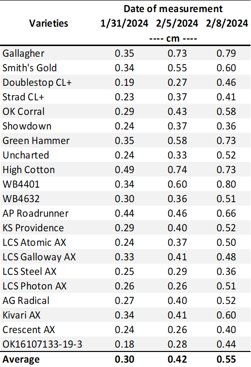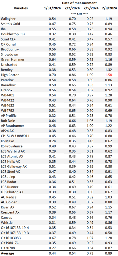 Table 2. First Hollow Stem (FHS) results for each wheat variety collected at Chickasha. Plots were planted on 10/02/24, with all sections left unclipped (i.e., not grazed). The FHS threshold is 1.5 cm (5/8″ or approximately the diameter of a dime). Reported values represent the average of ten measurements per variety. Varieties that exceed the threshold are highlighted in red.