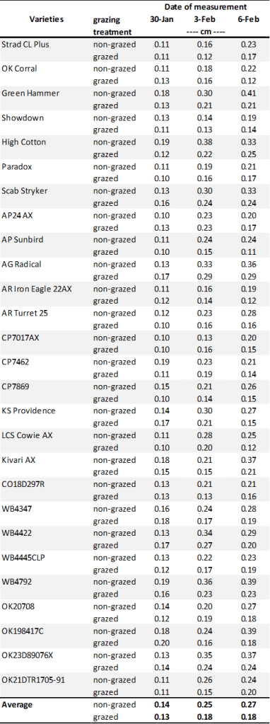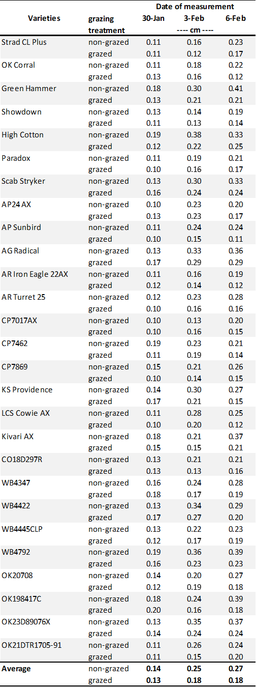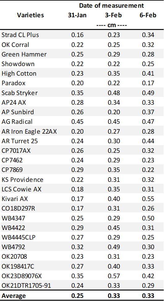 The latest FHS results for each variety planted in our forage trials at Stillwater and Chickasha are summarized below (Tables 1 and 2). Most varieties are still well below the 1.5 cm FHS threshold. However, if moisture and warmer conditions develop in the coming weeks, values could increase quickly.
