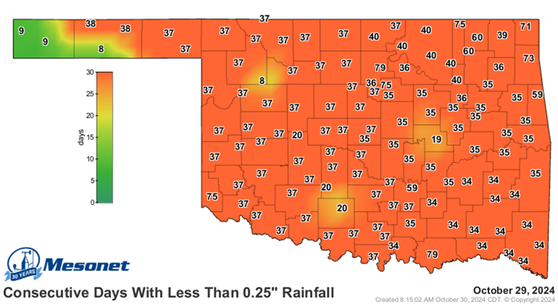 The next significant rain event occurred about a month later, almost past the optimal wheat planting window in some areas. With rain in the forecast for late October, many farmers chose to “dust in” their wheat ahead of the rain, while others opted to wait.